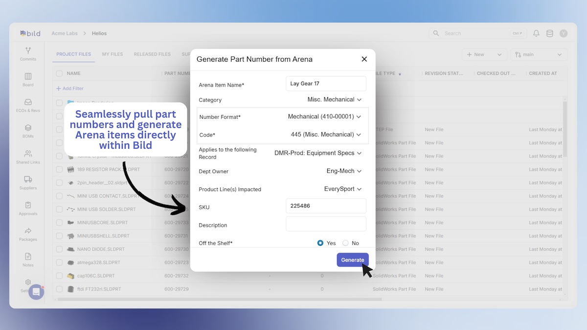 - Utilize part number generation from Arena and assign to designs in Bild, ensuring standardization for part numbering and ease-of-use for team